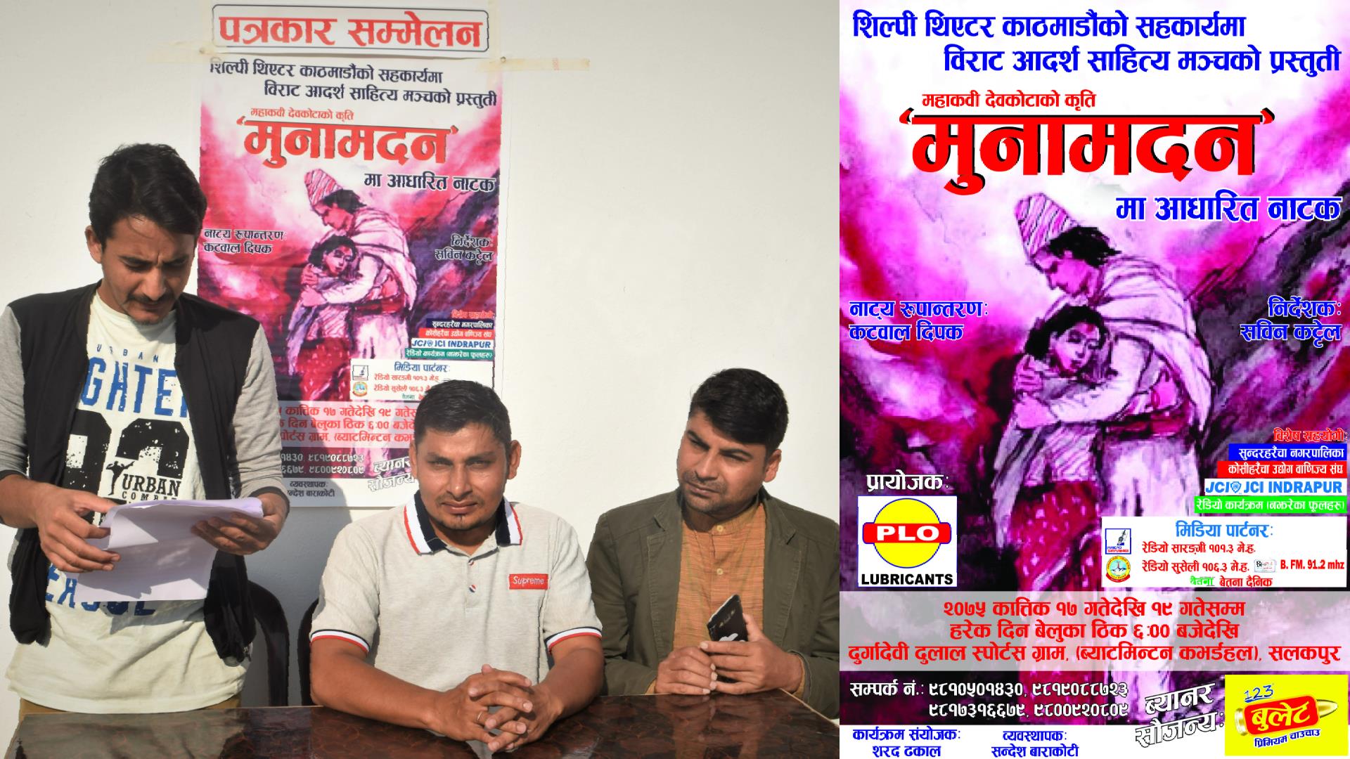 बेलबारी, कार्तिक १० / सुन्दरहरैचा नगरपालिकाको सलकपुरमा ‘मुनामदन’ नाटक कार्तिक १७ गते देखी हुने भएको छ । नाटक प्रस्तुत गर्ने स्थल सुन्दरहरैचा वाड नं.८ स्थित सलकपुरमा रहेको दुर्गादेवी दुलाल स्पोर्टस ग्राममा शनिवार पत्रकार सम्मेलन गर्दौ आयोजकले सो जनाकारी दिएका हुन ।