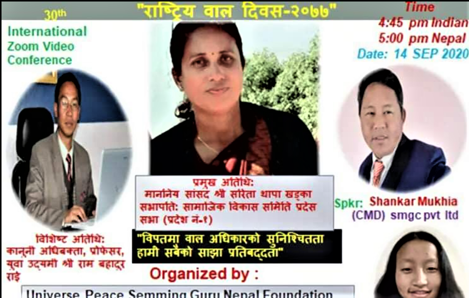 प्रमुख अतिथि तथा सामाजिक विकास समिति प्रदेश सभा प्रदेश नं १ का सभापति सांसद सरिता थापा खड्काले स्थानीय प्रदेश सरकारको तर्फबाट महिला तथा बालबालिकाहरूको हक, हित र अधिकारको सुनिश्चितताको यथेस्त पहलमा ध्यानाकर्षण रहेको बताइन । उनले साथै व्यक्ति, परिवार, समाज र राष्ट्रको उन्नतिमा सबैले सहकार्य र हातेमालो गर्नु पर्ने आवश्यकता औलादै कोभिड १९ को महामारीमा पनि विश्वव्यापी रूपमा जनचेतना जगाउने भर्चुअल कार्यक्रमको आयोजना गरेकोमा आयोजक प्रति आभार ब्यक्ता गरिन ।