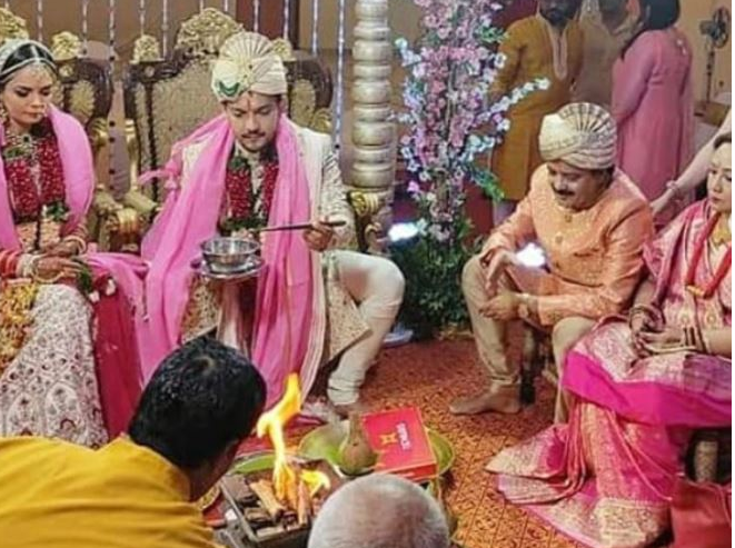 आदित्य नारायणका बाबा गायक उदित नारायण झा पनि विवाहको आनन्द लिइरहेको तस्बिरमा देख्न सकिन्छ ।