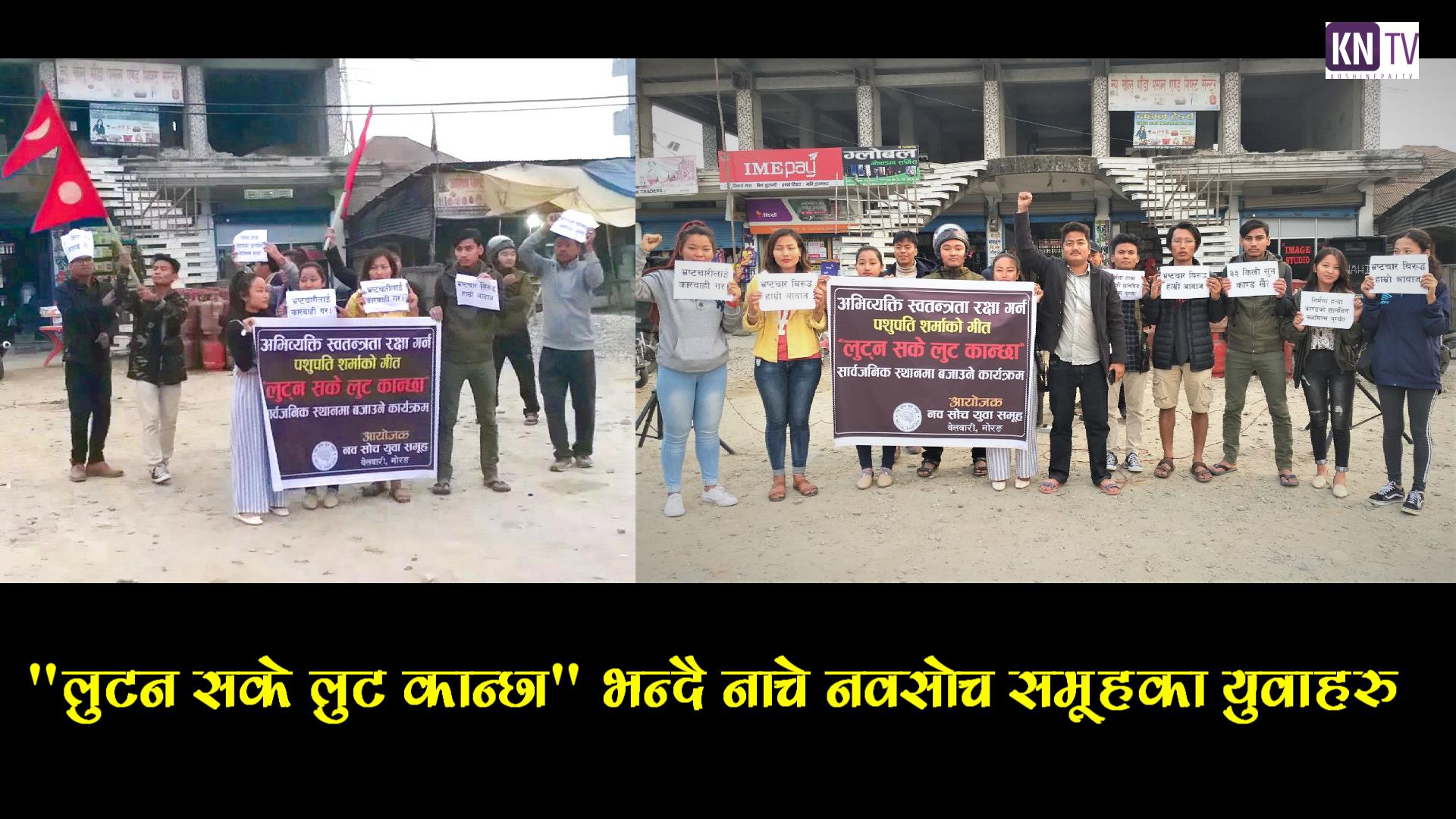 देशभरि विभिन्न सङ्घसंस्था तथा स्वतन्त्र युवाहरूले सडकबाट खबरदारी गरिरहेको बेला बेलबारीका सामाजिक संस्था नवसोंच युवा समूहले पनि अभिव्यक्ति स्वतन्त्र रक्षा गर्न पशुपति शर्माको गीत “लूटन सके लुट कान्छा” सार्वजनिक स्थानमा बजाएर शान्तिपूर्ण विरोध गरेको छ ।