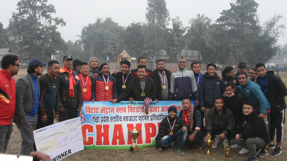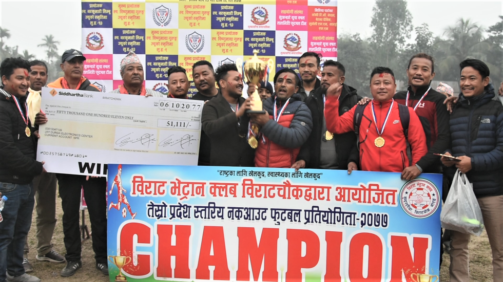 सुन्दरहरैचा, ६ माघ । सुन्दरहरैचामा जारी “तेस्रो प्रदेश स्तरीय भेट्रान नकआउट फुटबल प्रतियोगिता – २०७७” को उपाधि झापा भेट्रानले चुमेको छ । आज मंगलबार भएको प्रतियोगिताको फाइनलमा झापाले आयोजक टिम विराट भेट्रान विराटचौकलाई ६–१ गोलको भारी अन्तरले पराजित गर्दै उपाधि हात पारेको छ ।
