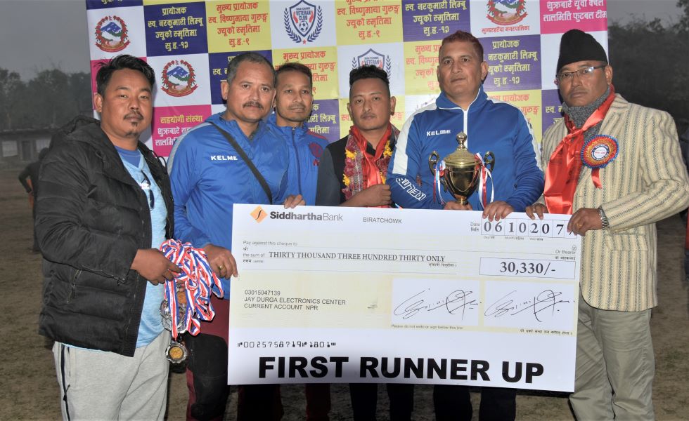 नरेन लिम्बुले ह्याट्रिक गरे भने रमेश गुरुङ र मित्र बस्नेतले एक एक गोल गरेर झापालाई प्रतियोगिताको उपाधि दिलाएको छ । आयोजक टिमका विष्णु सुनुवारले वनगोल गरे पछि झापाले ६ गोलको अग्रता पाएको थियो ।