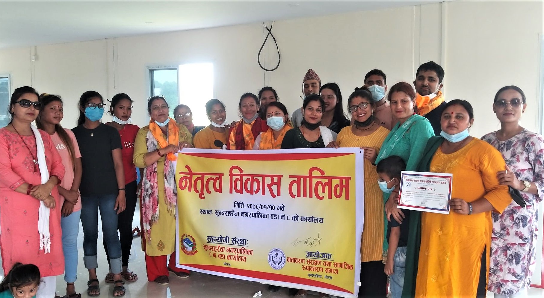 वातावरण संरक्षण तथा सामाजिक रुपान्तरण समाजका आयोजनामा कार्यक्रम भएको थियो । नेतृत्व विकास तालिमलाई सुन्दरहरैंचा नगरपालिका वडा न । ८ ले सहयोग गरेको थियो । करिव २५ जाना महिला दिदीबहिनी हरुको तालिममा सहभागिता रहेको थियो ।