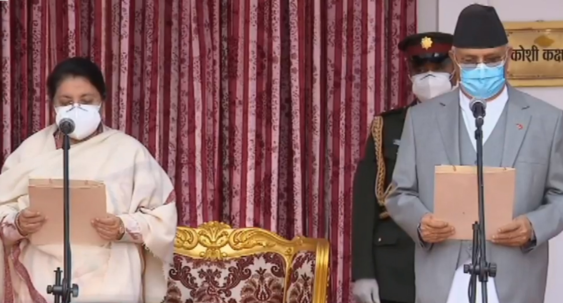 शुक्रबार शीतलनीवासमा आयोजित समारोहमा राष्ट्रपति विद्यादेवी भण्डारीसामु उनले शपथ लिएका हुन् । प्रतिपक्षी गठबन्धनले सरकारका लागि दाबी पेस गर्न नसके पछि राष्ट्रपति भण्डारीले संविधानको धारा ७६ (३) अनुसार संसद्को ठूलो दलको नेताको हैसियतमा ओलीलाई पुनः प्रधानमन्त्रीमा नियुक्त गरेकी थिइन् ।