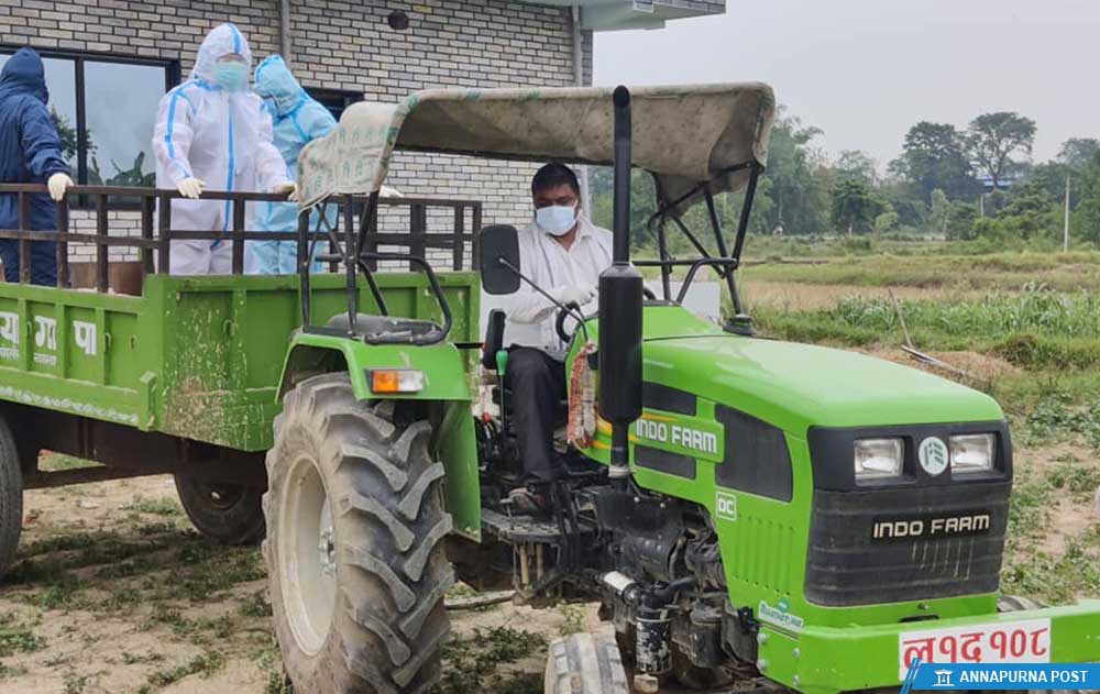 उनले ५ लिटर डिजेल र चार थान पिपिईमा सुरक्षाका मापदण्ड अपनाएर शवको व्यवस्थापन गरिएको बताए । गाउँपालिकाले केही वर्ष अघि फोहोरमैला व्यवस्थापनका लागि ट्याक्टर खरिद गरेको थियो । सोही ट्याक्टर अहिले गाउँपालिका अध्यक्ष आफैँले चलाएर संक्रमितको शव व्यवस्थापनमा लागेका छन् ।