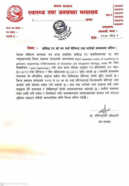 योसँगै नेपालमा परिवर्तित भाइरससहित तीन किसिमका भेरियन्ट रहेको पुष्टि भएको स्वास्थ्य मन्त्रालयको भनाइ छ ।