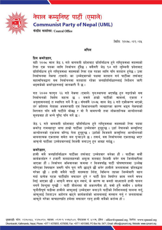 ओलीले भोटको लागि अपिल मात्र गरेका छैनन् आफ्नो दलबाट उम्मेदवार बनेका रामबहादुर थापा ‘बादल’ लाई मतदान गर्न पार्टी पङ्क्तिलाई निर्देशनसमेत दिएका छन् ।