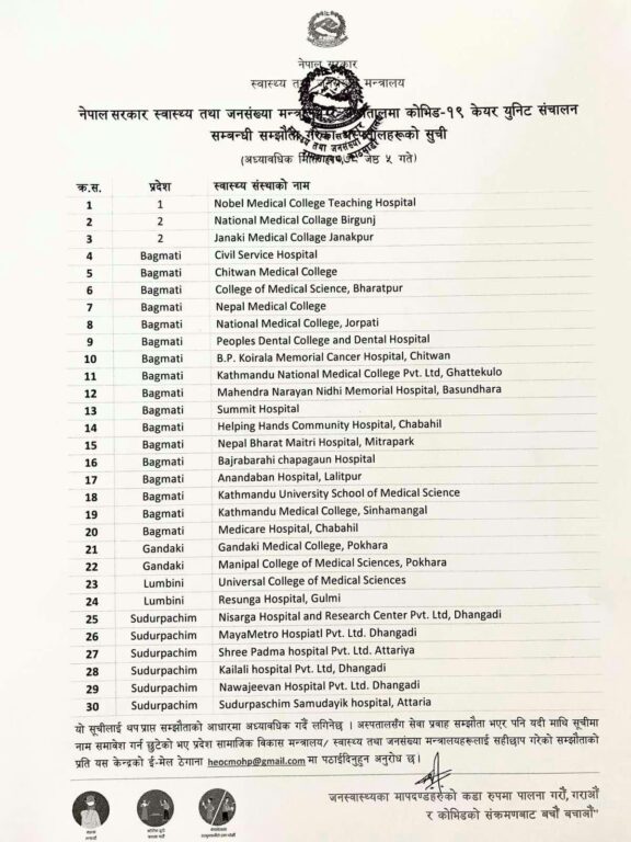 स्वास्थ्य तथा जनसङ्ख्या मन्त्रालयका सह–प्रवक्ता समीरकुमार अधिकारीले दिएको जानकारी अनुसार सात प्रदेशका ३० निजी अस्पताल तथा मेडिकल कलेजसँग कोरोना सङ्क्रमितको निःशुल्क उपचारका लागि सम्झौता गरेको जानकारी दिएका छन् ।