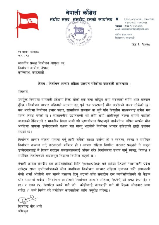 निर्वाचन आचार संहिता, २०७२ को दफा ५ घ (३) र (५) र दफा (६) विपरीत कार्य गर्ने जो कोहीलाई कारबाही गर्न काङ्ग्रेसले माग गरेको छ ।