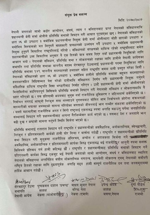 प्रधानमन्त्री केपी शर्मा ओलीसँगको मिलेमतोमा राष्ट्रपतिबाट रातारात प्रतिनिधिसभा विघटन गर्ने निर्णय वदनियतपूर्ण कार्य भएको बैठकपछि जारी विज्ञप्तिमा भनिएको छ ।