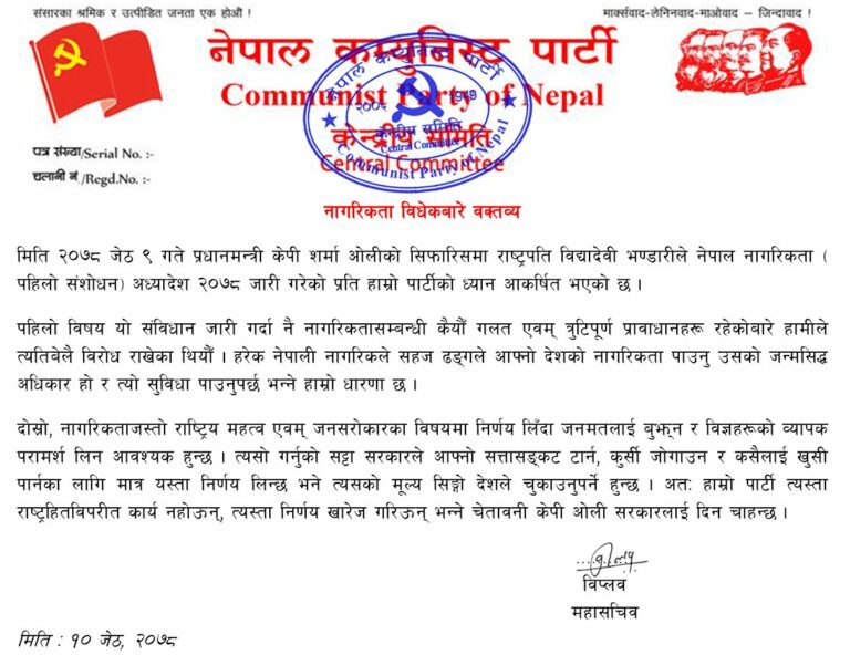सरकारले ल्याएको नागरिकता सम्बन्धी विधेयकको विरोध गर्दै नेपाल कम्युनिस्ट पार्टीका महासचिव नेत्रविक्रम चन्द ‘विप्लव’द्वारा जारी गरिएको विज्ञप्तिमा भनिएको छ ‘नागरिकता जस्तो राष्ट्रिय महत्त्व एवम् जनसरोकारका विषयमा निर्णय लिँदा जनमतलाई बुझ्न र विज्ञहरूको व्यापक परामर्श लिन आवश्यक हुन्छ ।