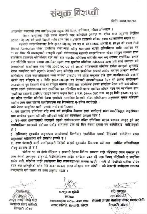 नेपाली काँग्रेस बेलबारी सह सभापति बद्री मण्डल, नेकपा माओवादी केन्द्र बेलबारी अध्यक्ष पर्शुराम सुबेदी र जसपा बेलबारी अध्यक्ष तिलक राईद्वारा हस्ताक्षरित विज्ञप्तिमा उपमेयर पराजुलीको संयोजकत्वमा गठित छानबिन समितिमा सदस्य पठाउन आतुर हुने तर कार्यपालिका सदस्यको संयोजकत्वमा गठन भएको समितिमा बस्न अस्वीकार गरेकोमा नेकपा एमालेको निर्णयप्रति प्रश्न उब्जिएको बताइको छ ।