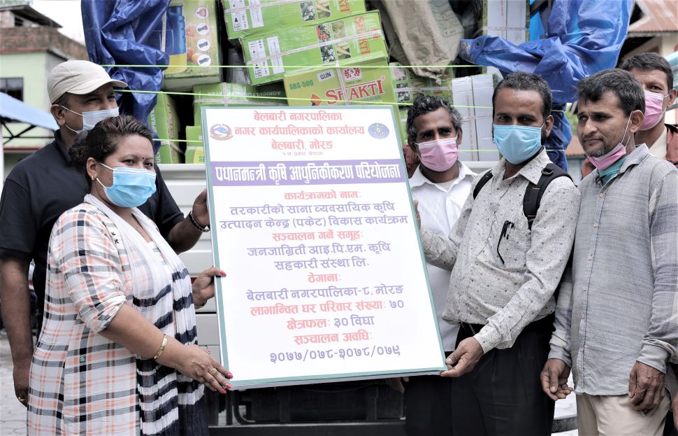 बेलबारी नगरपालिकाका उपप्रमुख ढाकाकुमारी पराजुलीले ती सामग्रीहरू किसानलाई हस्तान्तरण गरेकी हुन् । सो कार्यक्रमअन्तर्गत वडा नम्बर ५मा धानबाली, ८नम्बर वडामा तरकारी र ११ नम्बर वडामा बङ्गुर पकेट क्षेत्रका रूपमा विकास भइरहेको कृषि विकास शाखाका प्रमुख विनोद दाहालले बताए ।