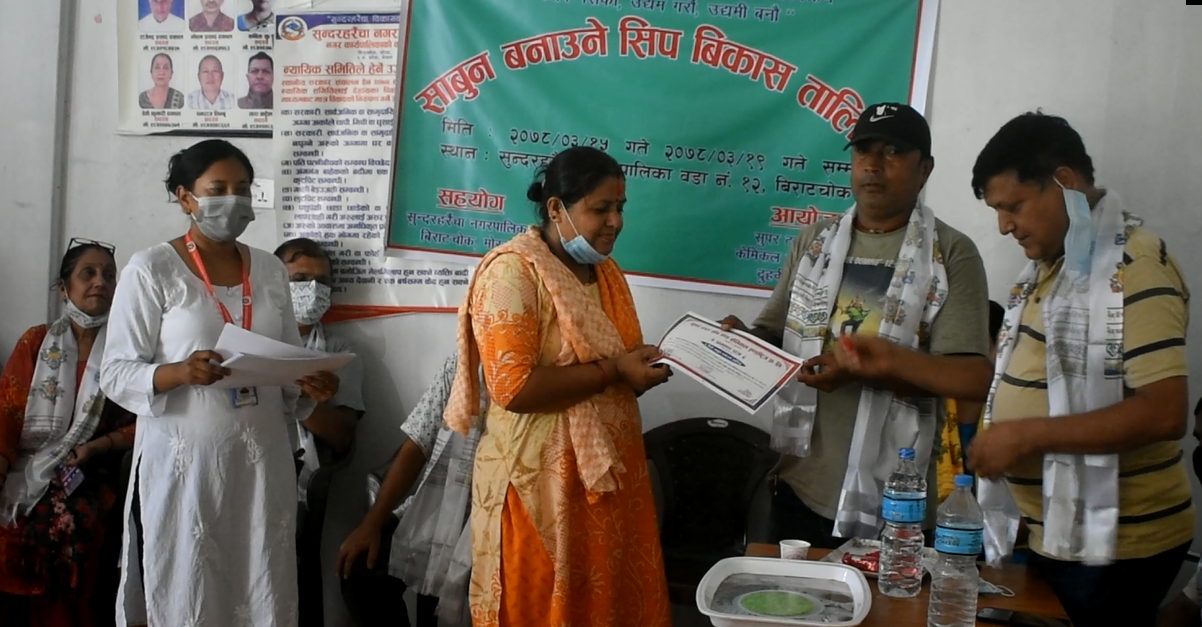 सुन्दरहरैँचा, २२ असार । गरिबी निवारणका लागि लघु उद्यम विकास कार्यक्रमअन्तर्गत सुन्दरहरैँचा नगरपालिकामा पाँच दिने व्यावसायिक तालिम सम्पन्न भएको छ । तालिम सुन्दरहरैँचा नगरपालिकाको आर्थिक सहयोग र सुपर टाटा सोप एण्ड केमिकल इण्डष्टिज प्रालि सुनसरीको आयोजनामा सम्पन्न भएको हो । १२ नं वाड कार्यालयको सभा हलमा सञ्चालन भएको पाँच दिने साबुन बनाउने व्यावसायिक तालिममा विभिन्न २० जना महिला तथा पुरुषको सहभागिता रहेको थियो ।