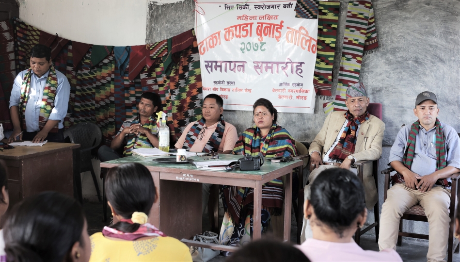बेलबारी, १४ कार्तिक । बेलबारी नगरपालिका वडा नं. ७ मा ढाका कपडा बुनाई तालिम सम्पन्न भएको छ । बेलबारी नगरपालिकाको आर्थिक सहयोगमा भएको ३० दिने ढाका कपडा बुनाई तालिमको शनिवार समापन भएको हो ।