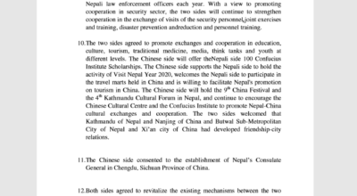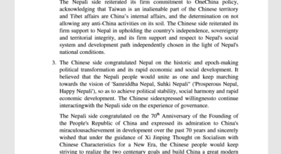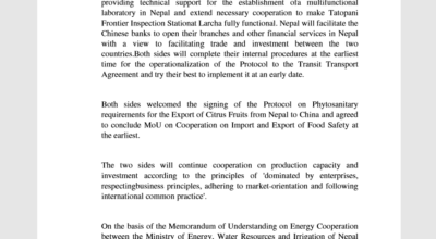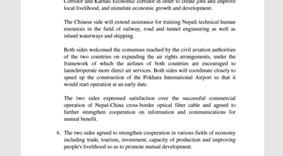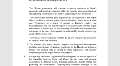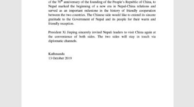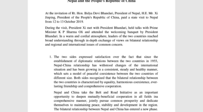 काठमाडौँ, २६ असोज। चिनियाँ राष्ट्रपति सी चिनफिङको दुई दिने नेपाल भ्रमण सम्पन्न भएसँगै १४ बुँदे संयुक्त वक्तव्य सार्वजनिक भएको छ । राष्ट्रपति सी आज आइतबार नेपाल भ्रमण पूरा गरेर स्वदेश फर्केका छन् ।