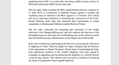 सोही सहमतिलाई उल्लेख गर्दै संयुक्त वक्तव्यमा काठमाडौँ–पोखरा–लुम्बिनी रेलवे परियोजनामा सहकार्यलाई अगाडि बढाउनुको साथै केरुङ – काठमाडौँ सुरुङ मार्गको सम्भाव्यता अध्ययन गर्ने विषयलाई पनि संयुक्त व्यक्तव्यमा उल्लेख गरिएको छ ।