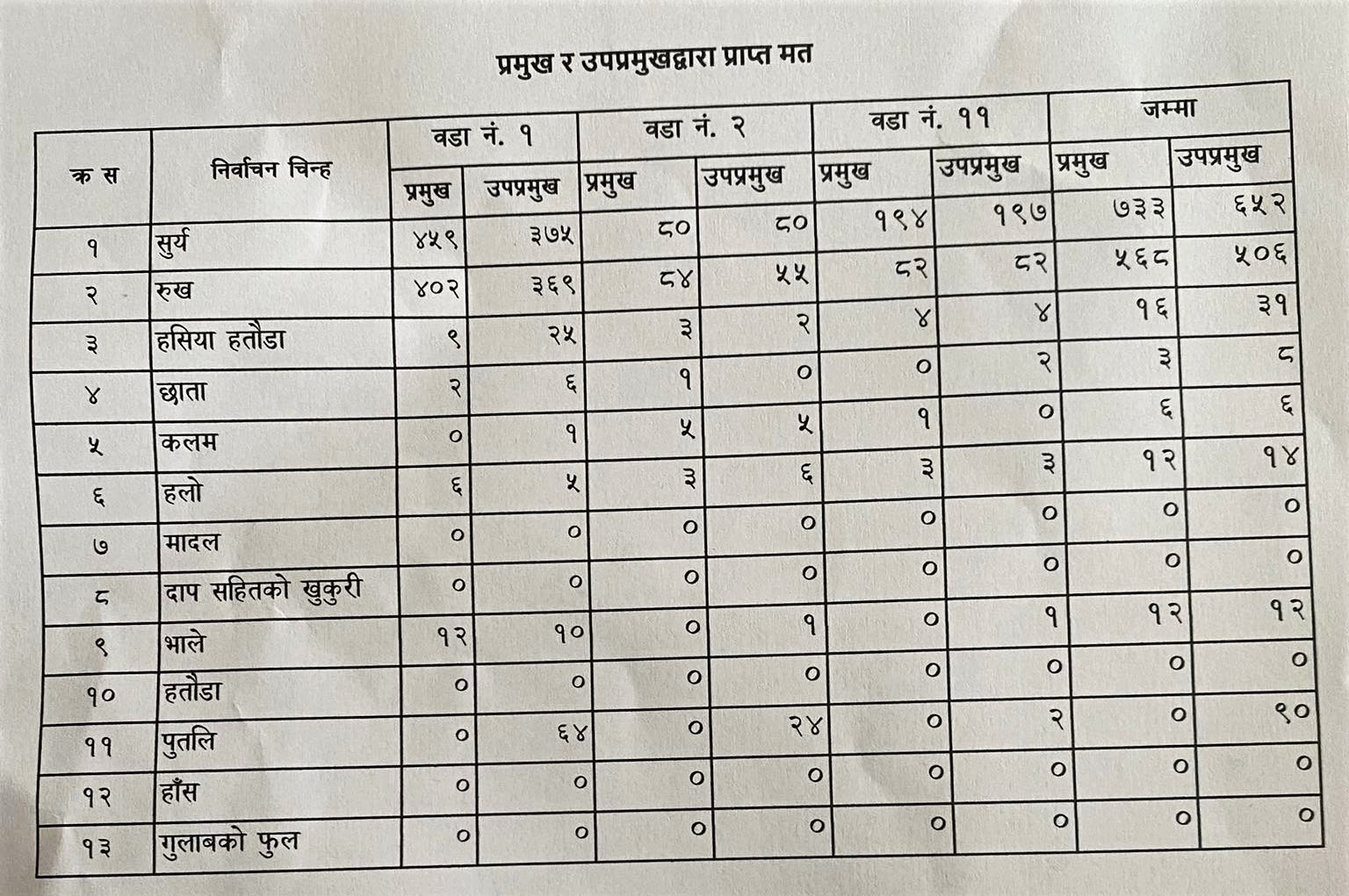 वडा नं. १ मा काँग्रेसका वडाध्यक्षका उम्मेदवार मणिबहादुर पुलामी मगरलाई ४४० मत खसेको छ भने एमालेका वडाध्यक्षका उम्मेदवार चक्रबहादुर खुलाललाई ४१३ मत खसेको छ । वडा नं. २ मा काँग्रेसका वडाध्यक्षका उम्मेदवार मणिसुन्दर थापालाई १०० मत खस्दा एमालेका कृष्णबहादुर गुरुङलाई ६४ मत खसेको छ ।