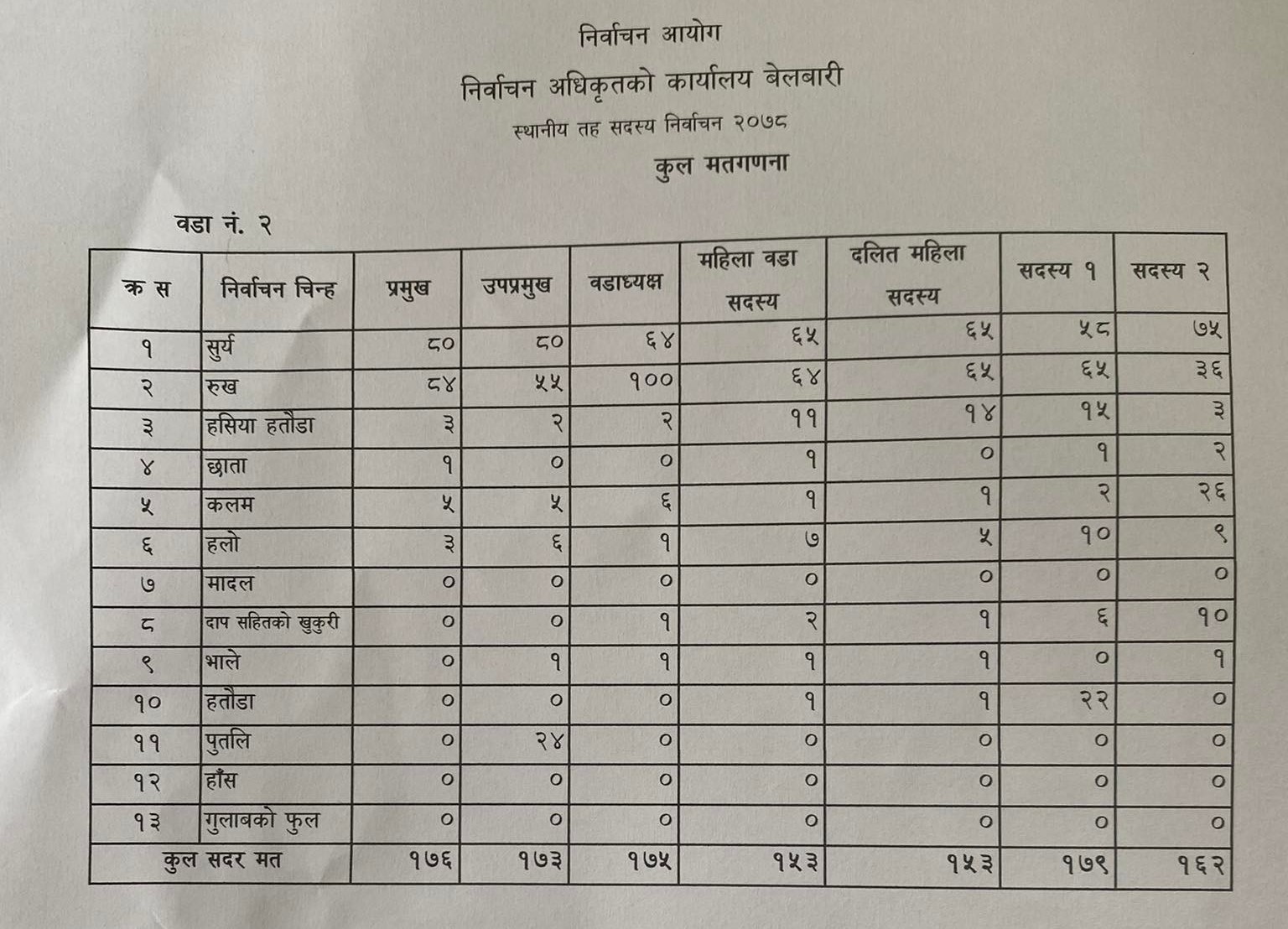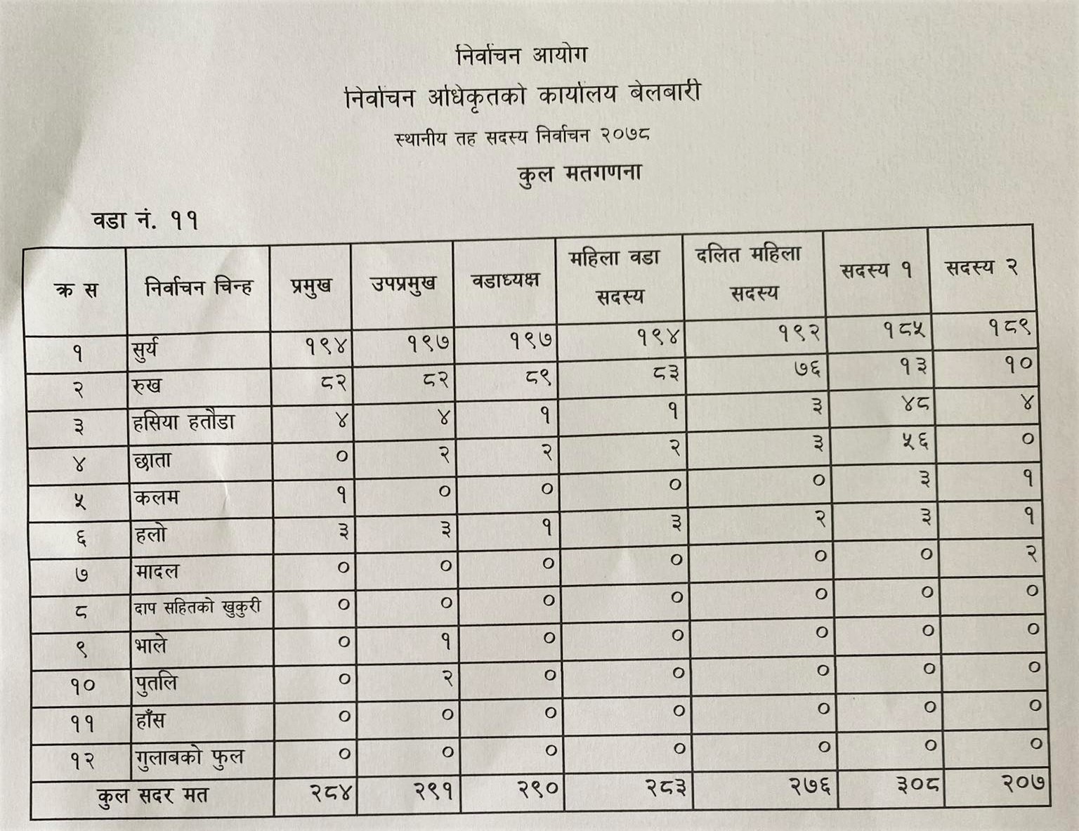 निर्वाचन अधिकृतको कार्यालय बेलबारीका अनुसार हालसम्म वडा नं. १,२ र ११ बाट एमालेका प्रमुखका उम्मेदवार डि.पि राईलाई ७३३ र उपप्रमुख तिलकुमारी नेउपानेलाई ६५२ मत खसेको छ भने नेपाली काँग्रेसको प्रमुख उम्मेदवार महेन्द्र सुवेदीलाई ५६८ र उपप्रमुख नितु थापालाई ५०६ मत खसेको छ । स्वतन्त्र उम्मेदवार रुकमणी धिमालको चुनाव चिन्नमा ९० मत खसेको छ ।