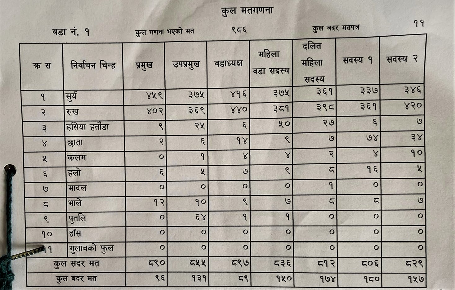 राष्ट्रिय प्रजातन्त्र पार्टीको चुनाव चिन्न हलोमा प्रमुखलाई १२ र उपप्रमुखलाई १४ मत खसेको छ । मंगोल नेशनल अर्गनाइजेसनको चुनाव चिन्न भालेमा प्रमुख र उपप्रमुख दुवैलाई १२ मत खसेको छ । निर्वाचन अधिकृत कृष्ण अधिकारीका अनुसार बिहान ४ बजे देखी गणना सुरु भएको थियो । गणना सुरु भएको करिब १२ घण्टा पछि मात्र पहिलो पटक हालसम्म खसेको मत संख्या सार्वजनिक गरेको हो ।