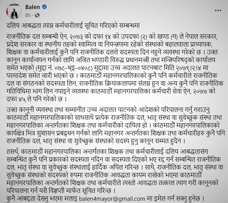 मेयर बालेनले काठमाडौं महानगरपालिका अन्तर्गतका शिक्षक तथा कर्मचारीलाई दलीय आबद्धतासँग सम्बन्धित कुनै पनि प्रकारको सदस्यता नदिन वा सदस्यता दिएको भए रद्द गर्न सम्बन्धित राजनीतिक दल, भातृ संस्थाहरूलाई अपिल गरेका छन् । उनले कुन दलमा आबद्धता थाहा पाए जानकारी गराउन आग्रह गर्दै इमेल दबभिलद्धmबथयच२नmबष्।िअयm सार्वजनिक गरेका छन् ।