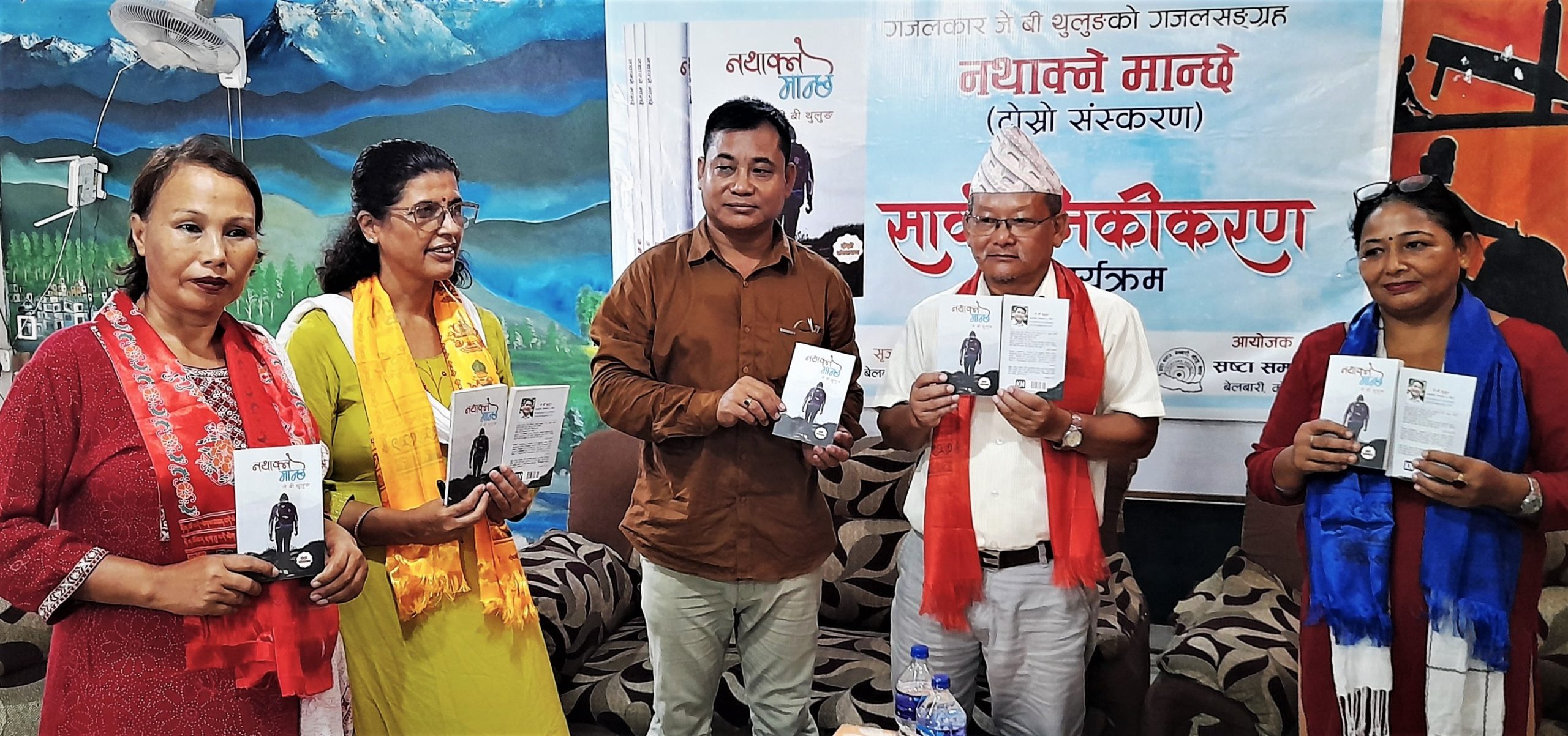 बेलबारी, १२ भाद्र । बेलबारीका कलाकार तथा गजलकार जे.वी थुलुङको गजलकृति नथाक्ने मान्छेको दोस्रो संस्करणको लोकार्पण भएको छ । बेलबारीमा शनिवार एक कार्यक्रमकाविच थुलुङको कृतिको लोकार्पण भएको हो ।