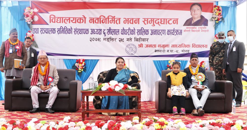 राष्ट्रपति भण्डारीले जनता नमुना माविको नवनिर्मित भवनको उद्घाटन गर्नुका साथै विद्यालयका संस्थापक अध्यक्ष स्वर्गीय दुखीलाल चौधरीको सालिकको समेत अनावरण गरिन् । उक्त अवसरमा स्काउट तथा विभिन्न जातीय संस्थाहरूले राष्ट्रपतिको सम्मानमा झाँकीहरूको प्रस्तुत गरेका थिए ।