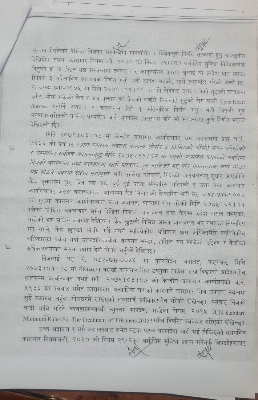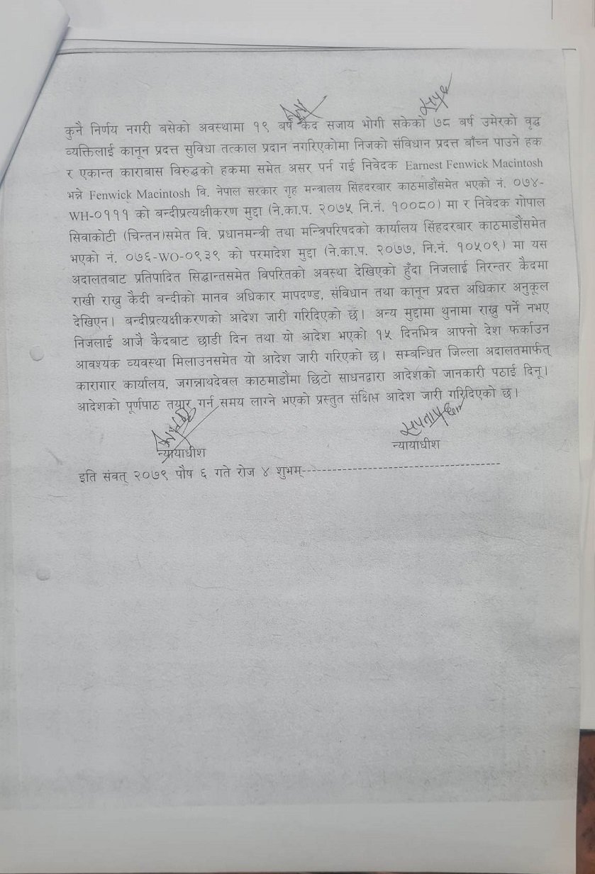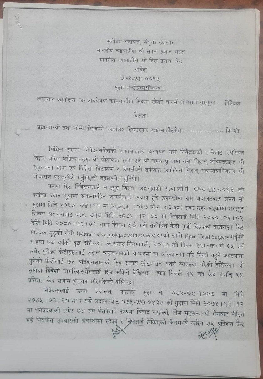 न्यायाधीश सपना प्रधान मल्ल र तिलप्रसाद श्रेष्ठको संयुक्त इजलासले चार्ल्सलाई आजै कैदबाट मुक्त गर्न र आदेश भएको १५ दिन भित्र आफ्नो देश फर्काउन आवश्यक व्यवस्था मिलाउन आदेश दिएको छ । आदेशमा वृद्धको सुविधा दिएर छाड्न भनिएको छ । शोभराजले गृह मन्त्रालय, कारागार व्यवस्थापन विभाग लगायतलाई विपक्षी बनाई रिट दायर गरेका थिए ।
