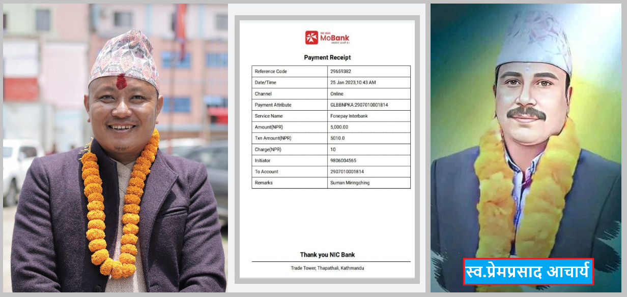 उनले फेसबुकमा लेखेका छन्,“हार्दिक श्रद्धाञ्जली प्रेम आचार्य जी,मृत्यु पूर्व तपाईँले स्टाटस मार्फत गर्नुभएको आग्रह बमोजिम रु.पाँच हजार (५०००) तपाइको परिवारको नाममा जम्मा गरेको छु, सबैले सकेको सहयोग गरेर वहाँको परिवारको जीवन रक्षा गरौँ” ।