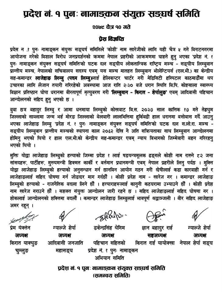 प्रेस विज्ञप्ति मार्फत प्रदेश नं १ पुनः नामाङ्कन संयुक्त सङ्घर्ष समितिले लिम्बुको निधनको जानकारी गराएको छन् । समितिले आज सार्वजनिक गर्दै प्रेस विज्ञप्तिद्वारा २ः३० बजे बि.पि. कोइराला स्वास्थ्य विज्ञान प्रतिष्ठान घोपामा निधन भएको जनाएको छ ।