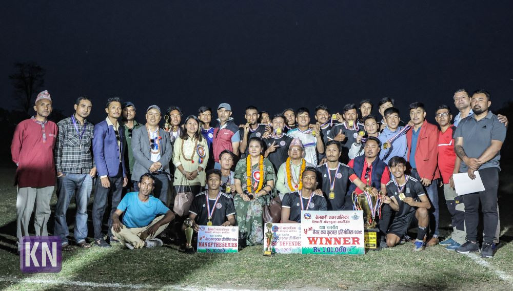 बेलबारी । बेलबारी नगरपालिका वडा नं.४ को बेतना खेलमैदानमा भएको ५ औँ वडा स्तरीय मेयरकप फुटबल प्रतियोगिताको उपाधि बेलबारी १ फुटबल टिमले चुमेको छ । शनिवार सम्पन्न फाइनल खेलमा वडा नं.१ ले ४ लाई ट्राईब्रेक्ररमा ४–३ गोलको अन्तरले हराउँदै उपाधि हात पार्न सफल भएको हो ।
