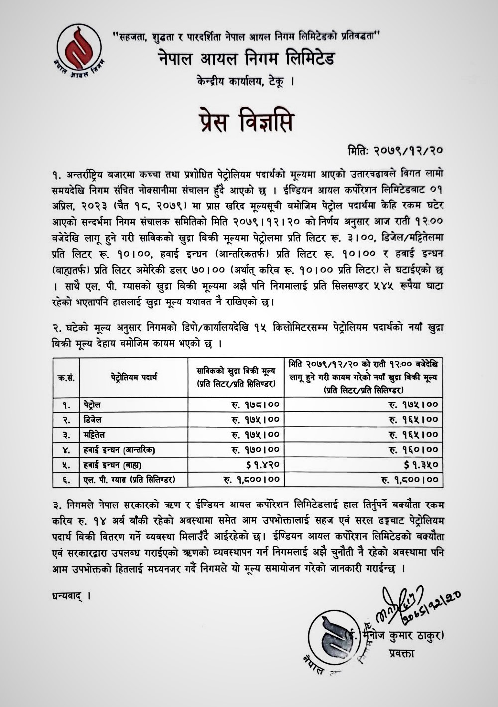 आईओसीलाई बुझाउनुपर्ने बक्यौता र सरकारलाई तिर्नुपर्ने ऋणका कारण निगमले मूल्य समायोजन गर्न आनाकानी गर्दै आएको थियो । ‘आइओसीको बक्यौता र सरकारी ऋणसहित अहिले पनि करिब १४ अर्ब दायित्व छ’ कार्यकारी निर्देशक थानीले भने, ‘उपभोक्तालाई केही राहत दिन अहिले मूल्य समायोजन गरेका छौँ ।’
