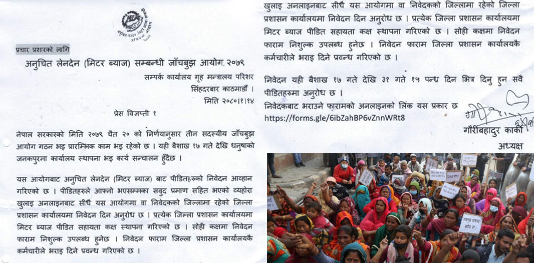 आयोगका अनुसार प्रत्येक जिल्ला प्रशासन कार्यालयमा मिटर ब्याज पीडित सहायता कक्ष स्थापना गरिएको छ । सोही कक्षमा निवेदन फाराम निःशुल्क उपलब्ध हुनेछ । आयोगले वैशाख १७ गतेदेखि धनुषाको जनकपुरमा कार्यालय सञ्चालनमा ल्याउँदै छ । सरकारले गत चैत २० गने तीन सदस्यीय जाँचबुझ आयोग गठन गरेको थियो ।