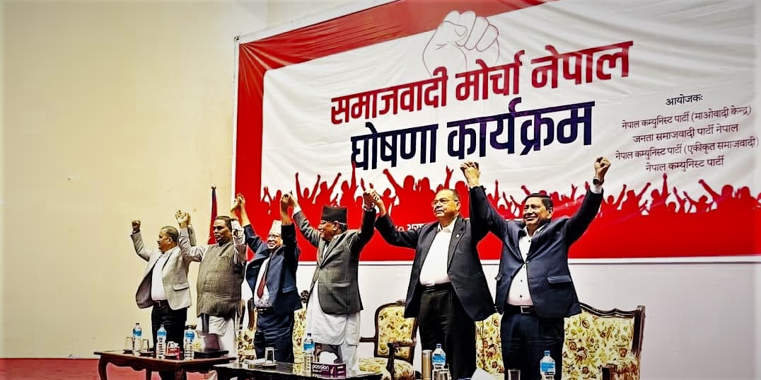 काठमाडौँ । सत्तारूढ गठबन्धनमा रहेका नेकपा (माओवादी केन्द्र) , जनता समाजवादी पार्टी, नेकपा (एकीकृत समाजवादी) र सत्ता बाहिर रहेको नेत्रविक्रम चन्द नेतृत्वको नेपाल कम्युनिस्ट पार्टी मिलेर समाजवादी मोर्चा घोषणा गरेका छन् । सोमबार राष्ट्रिय सभागृहमा आयोजित एक कार्यक्रमबिच समाजवादी मोर्चाको घोषणा भएको हो ।