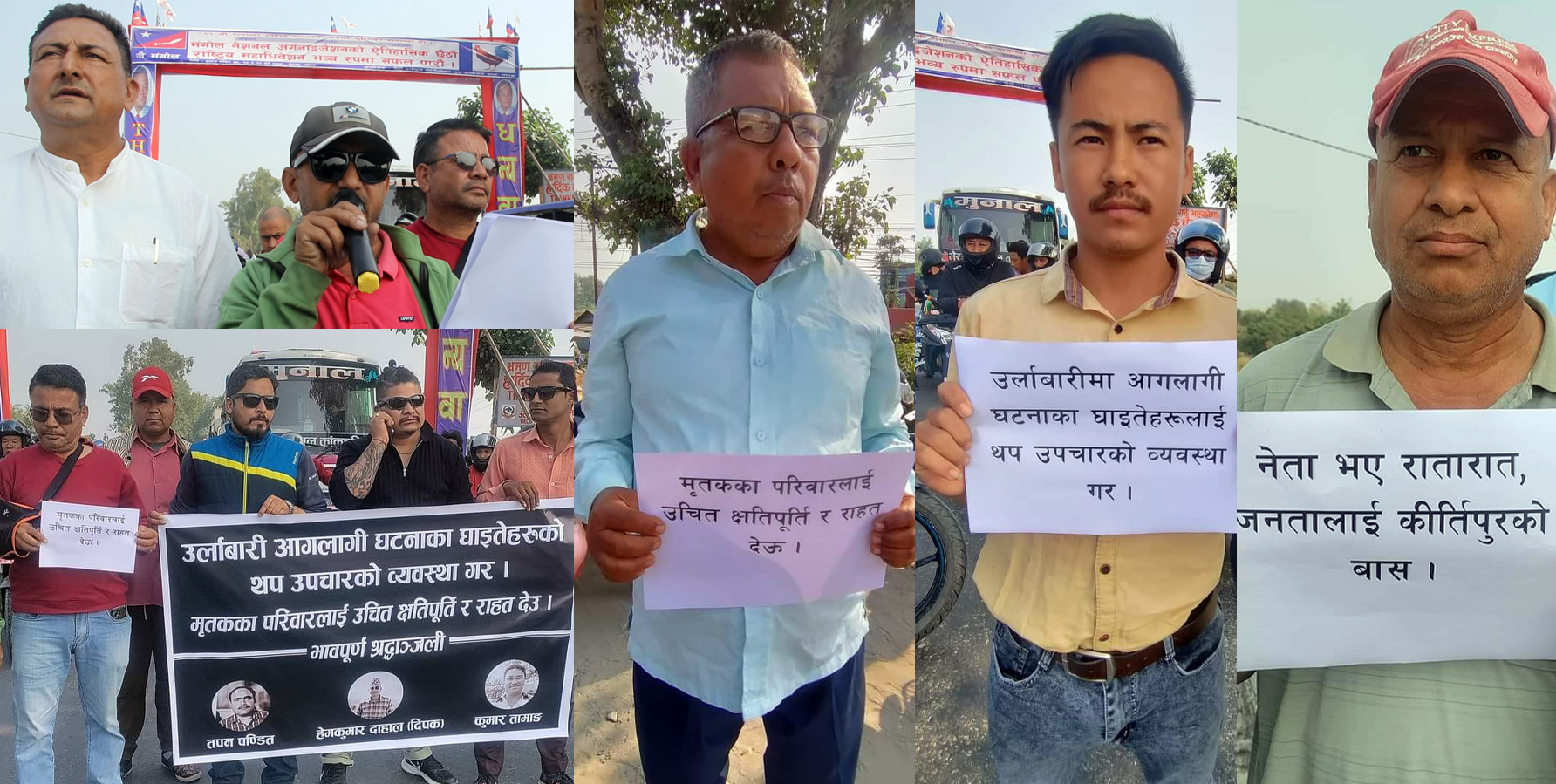 उर्लाबारी। उर्लाबारी आगलागी घटनाका गम्भीर घाइतेलाई थप उपचारको व्यवस्था मिलाउन माग गर्दै उर्लाबारीमा चक्काजाम गरिएको छ । गत कार्तिक २६ गते लक्ष्मीपूजाको राती १०ः४५ बजेको समयमा उर्लाबारी वडा नं. ७ निवासी दीपक कार्कीको घरमा रहेको स्नेहा ज्वेलर्समा आगलागी हुँदा ४ प्रहरीसहित २८ जना घाइते भएका थिए ।