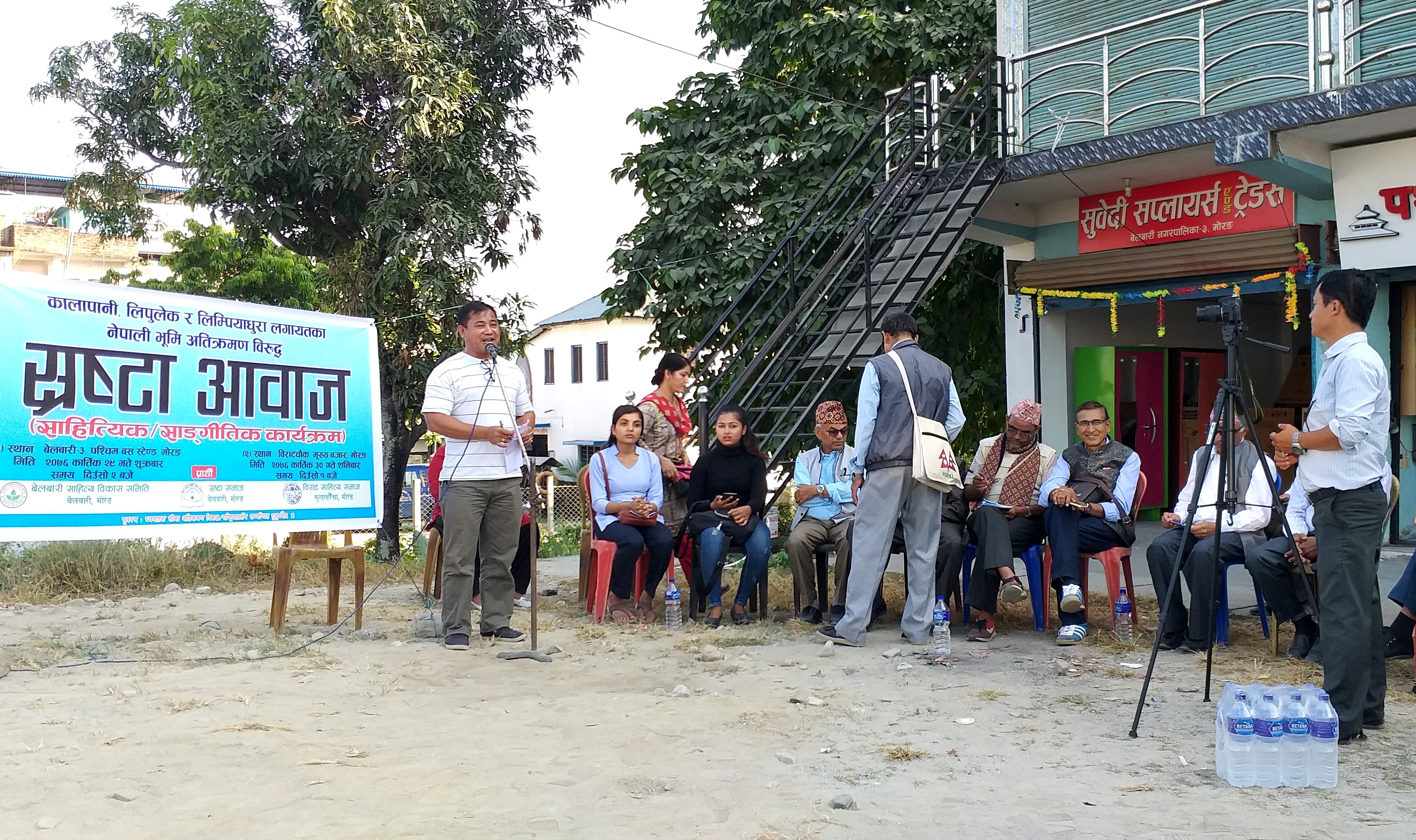 मोरङ, २९ कात्तिक । मोरङको बेलबारीमा नेपाली भूमि अतिक्रमणको विरुद्ध स्रष्टा आवाज साहित्य तथा साङ्गीतिक कार्यक्रम सम्पन्न भएको छ । शुक्रवार बेलबारी साहित्य विकास समिति, स्रष्टा समाज बेलबारी र विराट साहित्य समाज सुन्दरहरैचाको आयोजनामा सो कार्यक्रम सम्पन्न भएको हो ।