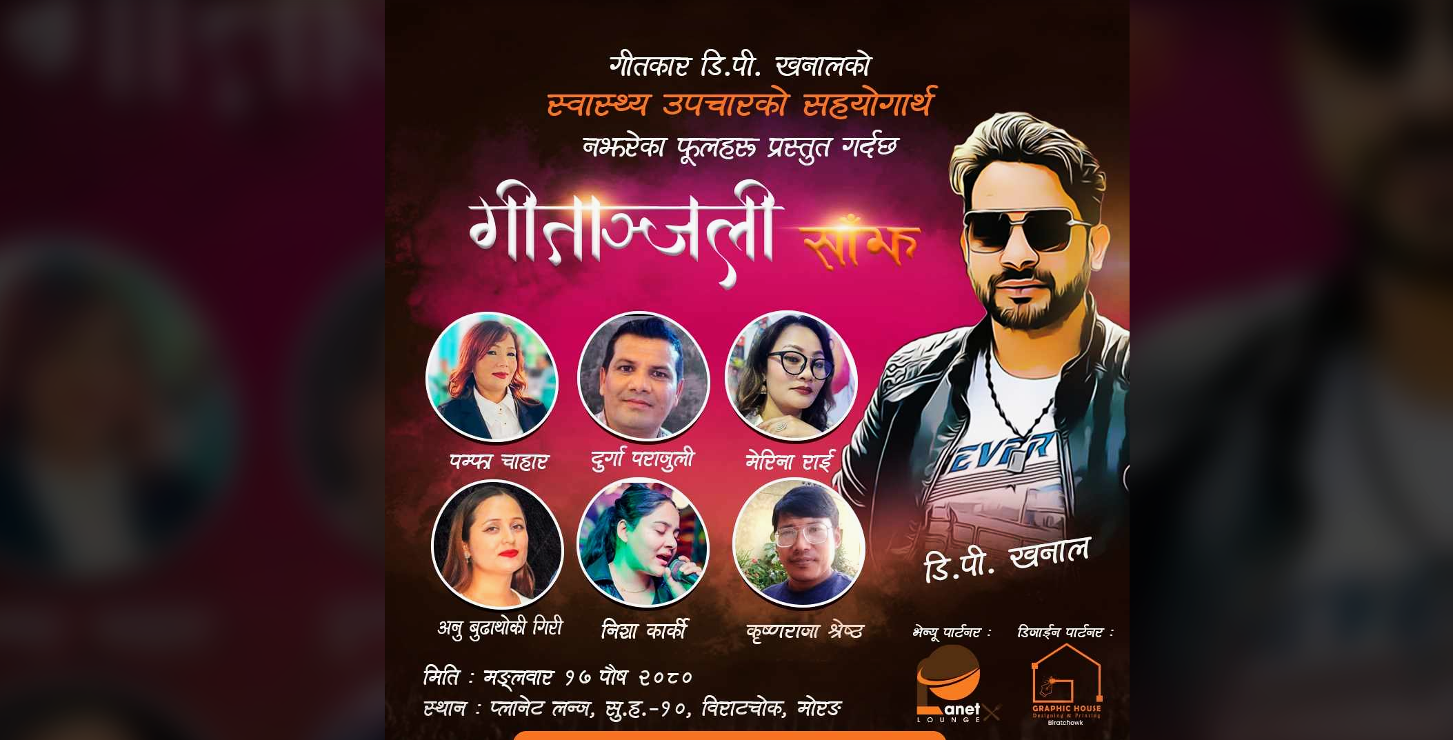 सुन्दरहरैँचा । केपी घिमिरेद्वारा सञ्चालित नझरेका फूलहरूको आयोजनामा लोकप्रिय गीतकार डि.पी. खनालको स्वास्थ्य उपचारका लागि सहयोगार्थ पलेँटी साँझ हुने भएको छ। मोरङको सुन्दरहरैँचा, विराटचोक स्थित प्लानेट लाउञ्जमा पौष १७ गते मङ्गलवार आयोजित पलेँटीलाई यस पटक ‘गीताञ्जली साँझ’ नाम दिइएको आयोजक तथा नझरेका फूलहरूका परिकल्पनाकार,संस्थापक एवम् प्रस्तोता केपी घिमिरेले बताएका छन्।