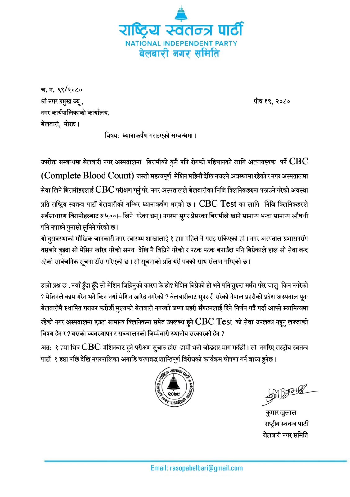 बेलबारी । राष्ट्रिय स्वतन्त्र पार्टी बेलबारी नगर समितिले बेलबारी नगर अस्पताल सम्बन्धी बेलबारी नगरपालिकालाई ध्यानाकर्षण गराएको छ । नगर अस्पतालमा रहेको बिग्रेको सि.बि.सी (कम्पेल्ट ब्लड काउन्टर) मेशिन बनाएर चाँडो जाँच सुरु गर्न आग्रह गर्दै नगरपालिकालाई ध्यानाकर्षण गराएको हो ।