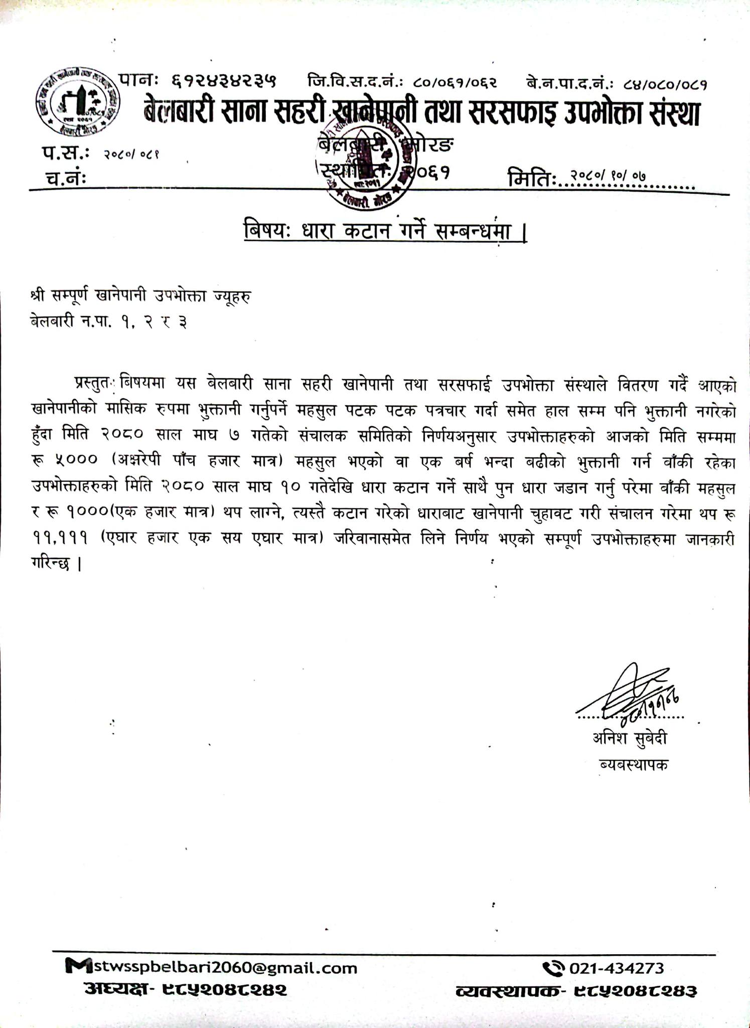 बेलबारी साना सहरी खानेपानी तथा सरसफाइ उपभोक्ता संस्थाका अनुसार पूर्व समिति र हालको नयाँ कार्य समितिद्वारा शुल्क भुक्तानीको लागि पटक पटक पत्र पठाउँदा पनि बेवास्ता गरे पछि मालपोत कार्यालयमा जडान गरिएको खानेपानीको धारामा जरिवानासहित २६ महिनाको शुल्क भुक्तानी नगरे सम्म पानी आपूर्ति कटौती गरेको छ ।