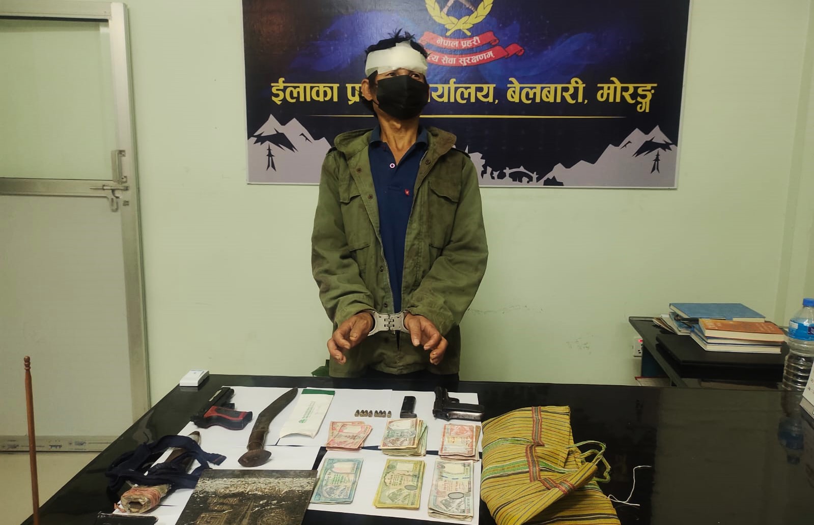 इलाका प्रहरी कार्यालय बेलबारीले निरकुमारलाई नियन्त्रणमा लिएसँगै एक इटालियन अटो पेस्तोल एक थान, पेस्तोलमा लोड गरिएको म्याक्जिन एक थान, लोड गरिएको ४ राउण्ड गोली, घटना स्थलमा कालो पलास्टीमा राखिएको थप ४ राउण्ड गोली, एक थान नक्कली पेस्तोल, दापसहितको खुकुरी एक थान, फरुवा एक थान, नगद रु.१८ हजार ७० बरामद गरेको छ । कोशी प्रदेश प्रहरी कार्यालय विराटनगरका अनुसार ज्यान मार्ने उद्योग तथा हतियार खरखजाना मुद्दा दर्ता भई ४ दिनको म्याद थप गरेर थप अनुसन्धान भइरहेको छ ।