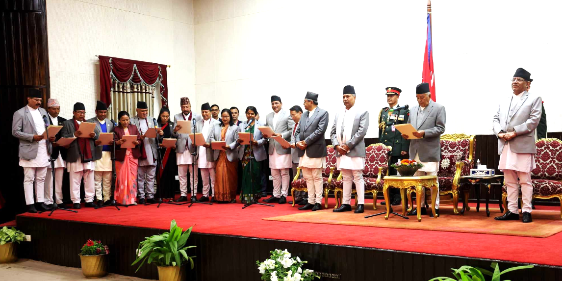 काठमाडौं । सरकारका नव नियुक्त मन्त्रीले पद तथा गोपनीयताको शपथ लिएका छन् । शीतल निवासमा आयोजित विशेष समारोहमा राष्ट्रपति रामचन्द्र पौडेलले उनीहरूलाई शपथ ग्रहण गराएका हुन् ।