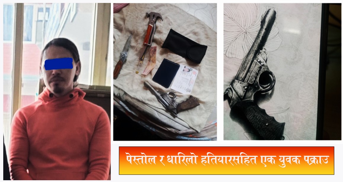 काठमाडौँ । पेस्तोल, धारिलो हतियारसहित एक युवकलाई प्रहरीले पक्राउ गरेको छ । जिल्ला ताप्लेजुङ फुङलिङ नगरपालिका वडा नं. ०९ निवासी हाल काठमाडौँ वडा नं. ०६ सरस्वतीनगर बस्दै आएका वर्ष २८ का प्रशान्त पराङदेवा लिम्बुलाई हातहतियारसहित पक्राउ गरेको हो ।