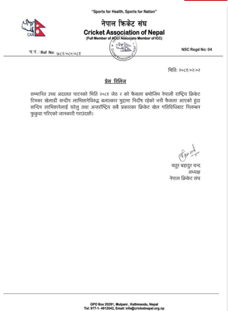 ‘सम्मानित उच्च अदालत पाटनको मिति २०८१ जेठ २ को फैसला बमोजिम नेपाली राष्ट्रिय क्रिकेट टोलीका खेलाडी सन्दीप लामिछानेविरुद्ध बलात्कार मुद्दामा निर्दोष रहेको भनी फैसला आएको हुँदा सन्दीप लामिछानेलाई घरेलु तथा अन्तर्राष्ट्रिय सबै प्रकारका क्रिकेट खेल गतिविधिबाट निलम्बन फुकुवा गरिएको जानकारी गराउँदछौ’, विज्ञप्तिमा भनिएको छ ।