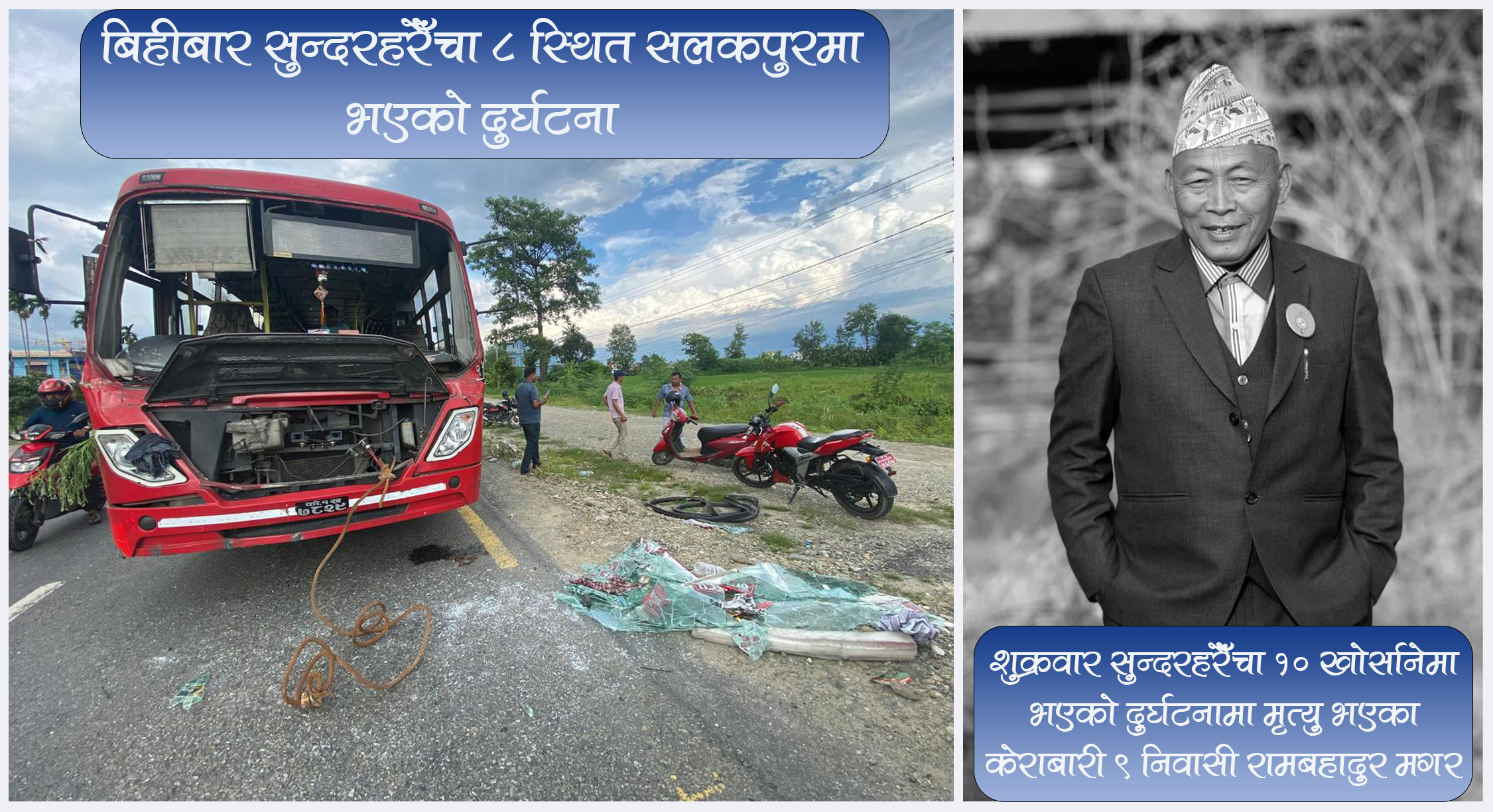 सुन्दरहरैँचा । सुन्दरहरैँचामा निरन्तर दुई दिन सवारी दुर्घटना भएको छ । सवारी दुर्घटनामा ६ जना घाइते र १ जनाको मृत्यु भएको छ ।