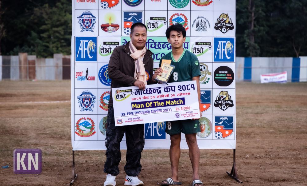 खेलको मेन अफ द म्याच बेलबारीका मौसम लिम्बु घोषित भएका छन् । उनले नगद पुरस्कार रु.५ हजार प्राप्त गरेका छन् । भोली चित्लाङ फुटबल क्लब, काठमाडौँ र चात्या सा, दमकबिच प्रतिस्पर्धा हुने केराबारी फुटबल क्लबका अध्यक्ष प्रितम लिम्बुले जनाएको छ ।