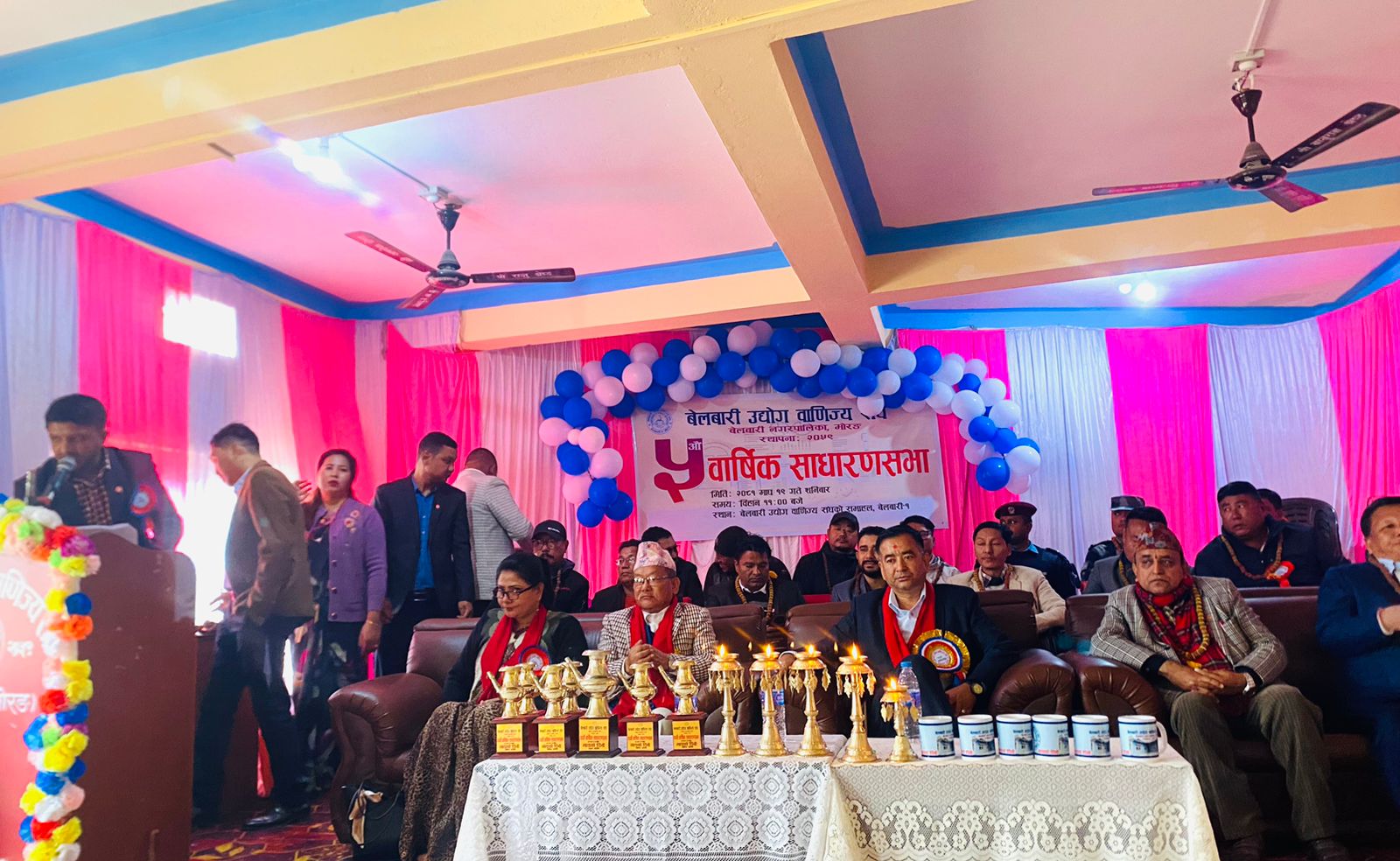 बेलबारी । बेलबारी उद्योग संघको पाँचौँ वार्षिक साधारणसभा सम्पन्न भएको छ । शनिवार सम्पन्न साभारणसभामा बेलबारीका व्यवसायीहरूको बाक्लो उपस्थिति रहेको थियो ।