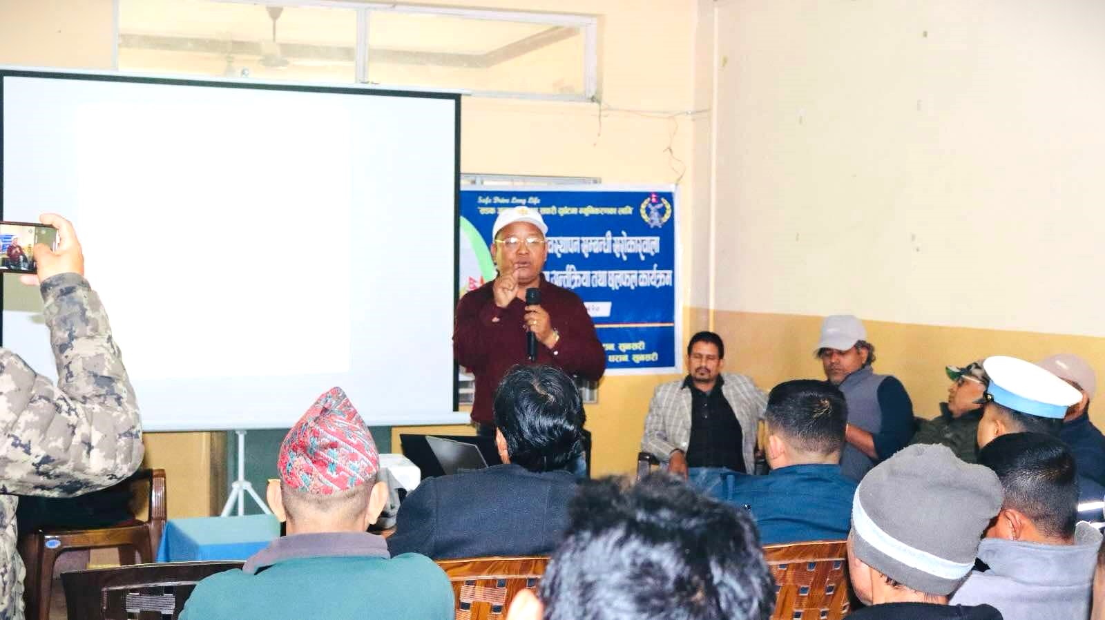 कार्यक्रममा नेपाल यातायात व्यवसायी राष्ट्रिय महासङ्घ कोशी प्रदेश संयोजक सरोज श्रेष्ठले मादक पदार्थ र लागु पदार्थ सेवन गरेर सवारी चलाएको प्रमाणित भएमा त्यस्ता सवारीसाधनलाई छुटपुर्जी रोक्का गरिने बताउनुभयो । कार्यक्रमका प्रमुख अतिथि समेत रहनु भएका श्रेष्ठले सडक दुर्घटना हुँदा राज्यले अनुसन्धान गरेर गल्ती गर्ने सवारीसाधनलाई क्षतिपूर्ति भराइने कोशी प्रदेश यातायात व्यवस्था ऐनमा उल्लेख भएको भएता पनि गल्ती नहुँदा पनि ठुलो सवारीसाधनले तिर्नु परेको बताउनु भयो । इलाका प्रहरी कार्यालय धरानमा प्रमुख डिएसपी प्रकाश जबेगुले सडक दुर्घटना हुँदा चालकहरू र सवारी धनीलाई प्रभावित हुने सवारी तथा यातायात व्यवस्था ऐनका दफाहरू बारे प्रशिक्षित गर्नुभयो ।