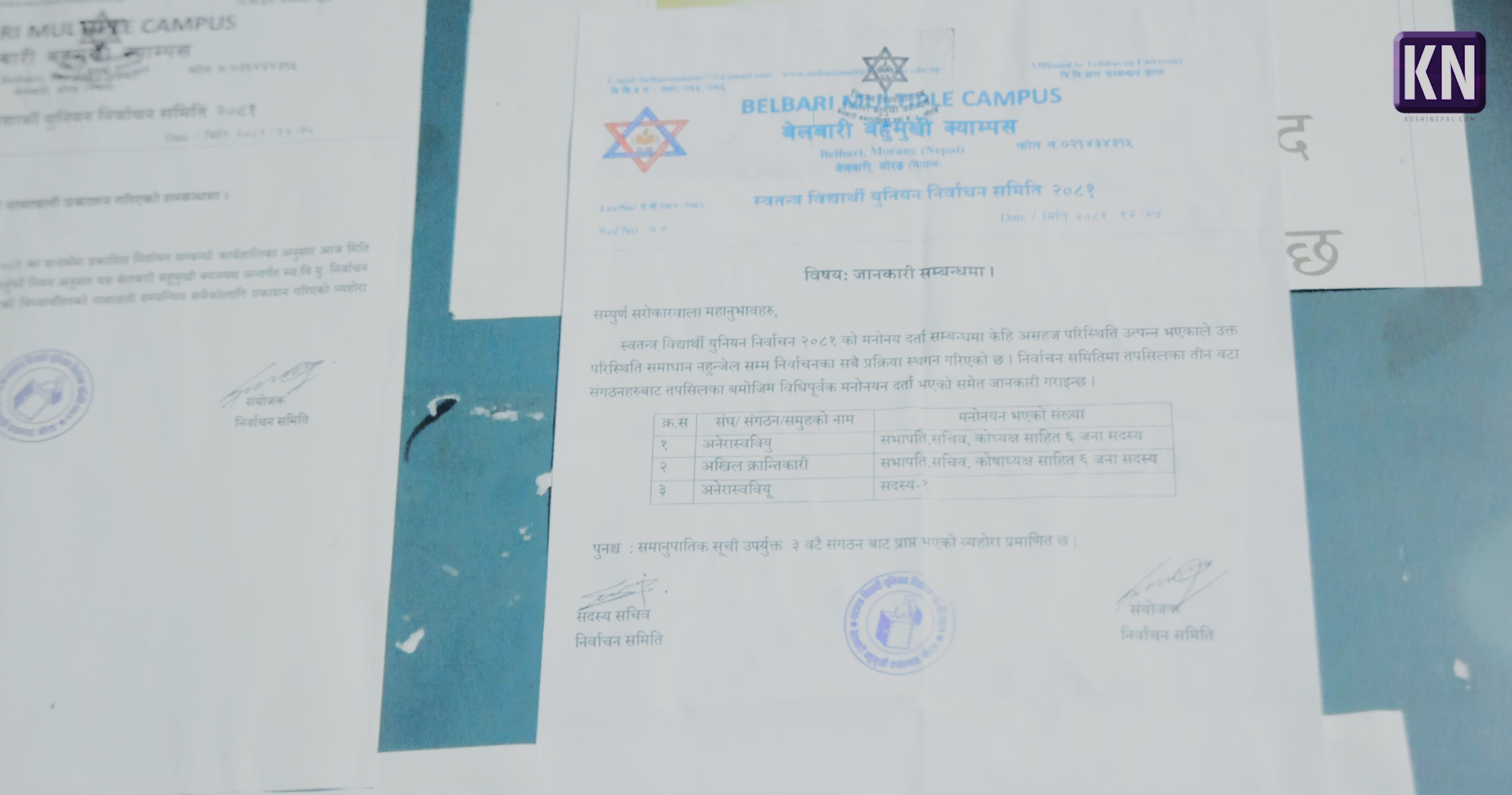 बेलबारी । बेलबारी बहुमुखी क्याम्पस स्वतन्त्र विद्यार्थी युनियन निर्वाचन २०८१ को मनोनयन दर्तामा नेपाल विद्यार्थी सङ्घ (नेविसँघ) को आन्तरिक विवादको करण निर्वाचन समितिले निर्वाचन प्रक्रिया रोकेको छ । नेवि सङ्घको आन्तरिक विवादले दर्ता प्रक्रियाबाट बाहिरिँदा निर्वाचन आयोगले निर्वाचनको सबै प्रक्रिया स्थगन गरेको हो ।