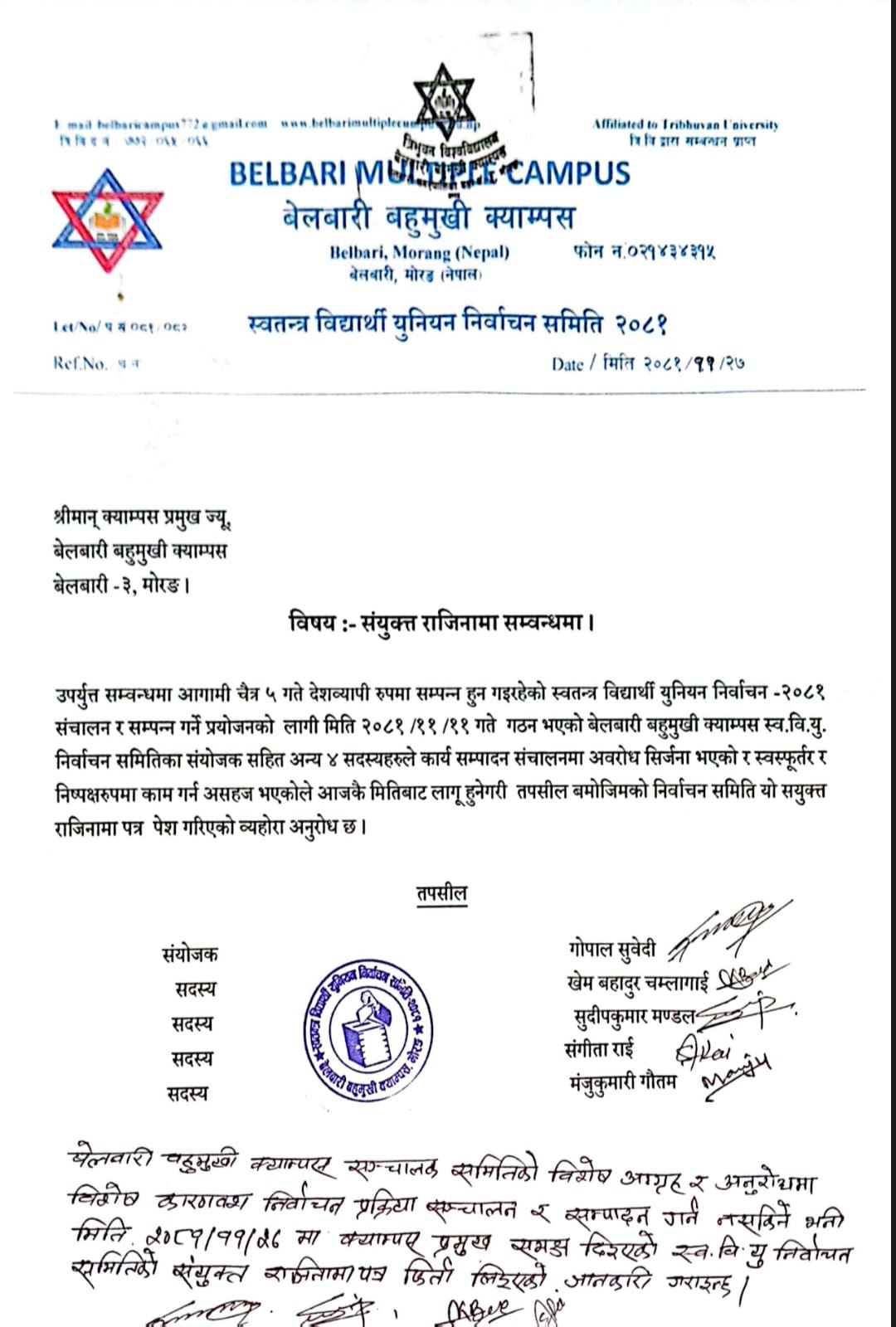 बेलबारी क्याम्पस स्ववियु निर्वाचन समितिका संयोजक गोपाल सुवेदीसहित ५ जनाले कार्य सम्पादन सञ्चालनमा अवरोध सिर्जना भएकोले राजीनामा दिएको पत्र फिर्ता लिइएको जानकारी क्याम्पसले गरेको छ । निर्वाचन समितिको सदस्यमा खेम बहादुर चम्लागाई, सुदीपकुमार मण्डल, सङ्गीता राई, मंजुकुमारी गौतम रहेका छन् ।