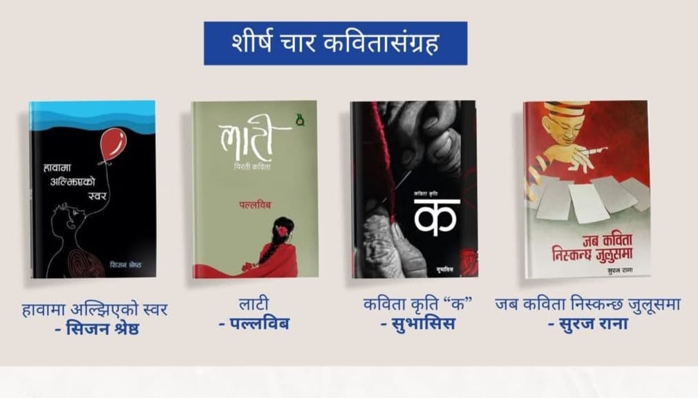 यस वर्षको पुरस्कारका लागि सिजन श्रेष्ठको ‘हावामा अल्झिएको स्वर’, पल्लविबको ‘लाटी’, सुभासिसको ‘क’ र सुरज रानाको ‘जब कविता निस्कन्छ जुलुसमा’ छनोट भएको हो ।